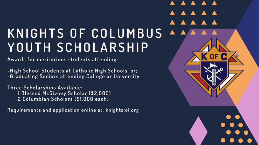 The Knights of Columbus Council 8104 will again be offering three scholarships to deserving students at the parish. Eligible students must meet certain criteria, which is detailed on the application form. Applications will close on May 31st.